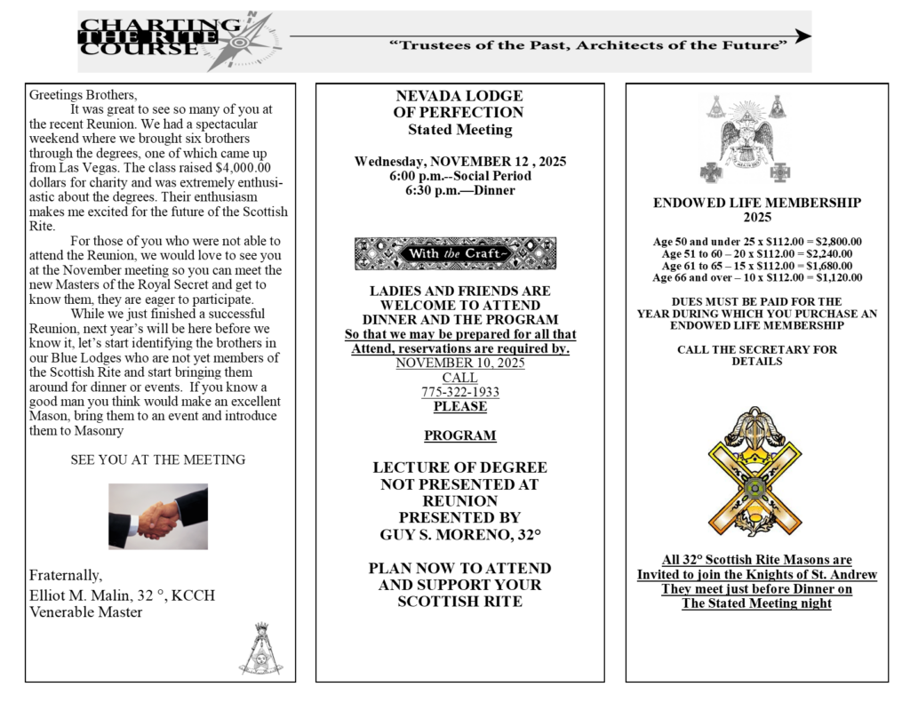 For those of you who were not able to attend the Reunion, we would love to see you at the November meeting so you can meet the new Masters of the Royal Secret and get to know them, they are eager to participate.